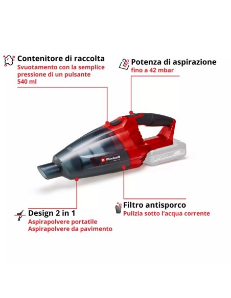 L’aspirapolvere portatile a batteria Einhell TE-VC 18 Li-Solo è la soluzione compatta e potente per la pulizia rapida di qualsiasi superficie, dai pavimenti duri alla moquette, dai divani alle zone difficili da raggiungere. Fa parte della famiglia Power X-Change, che permette di utilizzare la stessa batteria per tutti i dispositivi della serie, eliminando l’ingombro dei cavi e la necessità di più caricabatterie.