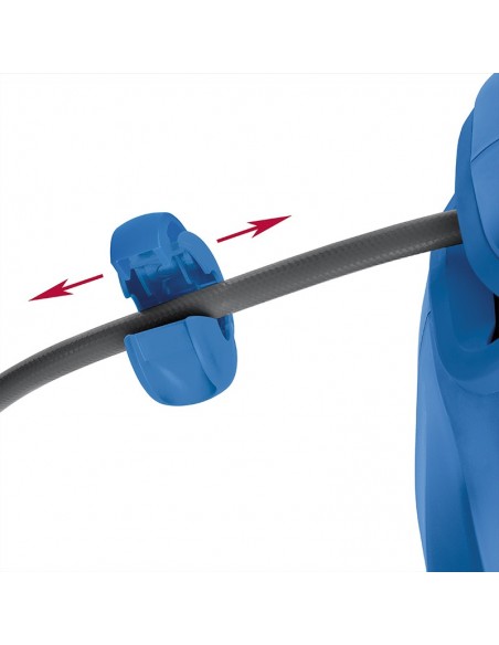 Il sistema interno con carrello di distribuzione consente un avvolgimento uniforme del tubo, evitando pieghe e usura prematura. La sfera di arresto regolabile senza attrezzi permette di impostare facilmente la lunghezza desiderata, migliorando ergonomia e velocità operativa.