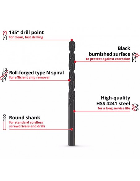 Realizzate in acciaio HSS 4241 di alta qualità, le punte assicurano resistenza e buone prestazioni di taglio. La punta a 135° permette un centraggio rapido e una foratura precisa, mentre la spirale rullata tipo N agevola l’espulsione dei trucioli.