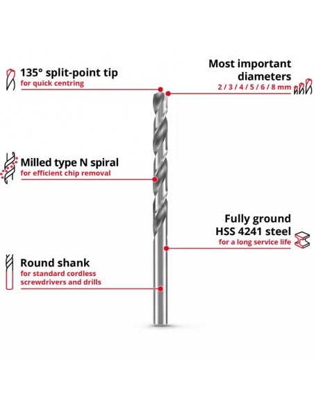 Queste punte, realizzate in acciaio HSS 4241 di alta qualità, garantiscono durata e prestazioni elevate anche in caso di utilizzo frequente. L’angolo di affilatura a 135° assicura un centraggio rapido e una foratura pulita e veloce, riducendo il rischio di slittamenti sul materiale.