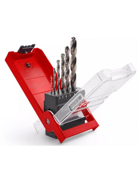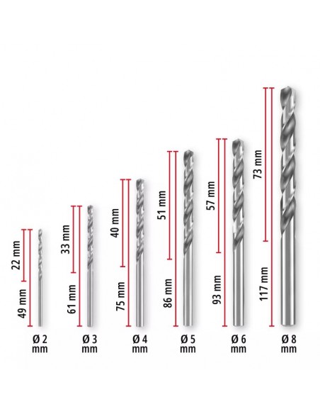 Il set include i diametri più utilizzati (2 / 3 / 4 / 5 / 6 / 8 mm), rendendolo perfetto per lavori di foratura su acciaio, alluminio, lamiera, metalli non ferrosi e plastica. Non sono invece adatte per l’acciaio inox.
