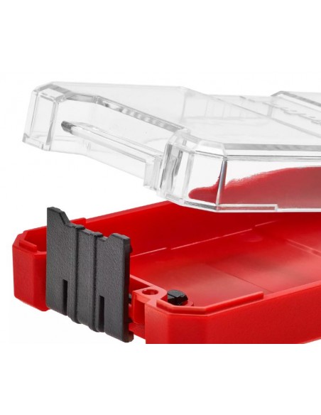 Le punte sono fornite in una valigetta compatta e robusta, che consente di conservarle in modo ordinato e sicuro. Il coperchio trasparente permette di controllare a colpo d’occhio il contenuto, mentre la chiusura a clip autobloccante garantisce stabilità durante il trasporto. Inoltre, grazie al foro Euro, la valigetta può essere facilmente appesa in garage o in officina.
