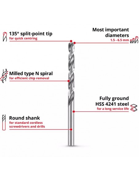 Realizzate in acciaio HSS 4241 ad alte prestazioni, queste punte garantiscono lunga durata e affidabilità anche in caso di utilizzo frequente. L’angolo di affilatura a 135° assicura un centraggio rapido e una foratura pulita e precisa, riducendo il rischio di slittamento.