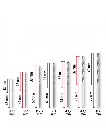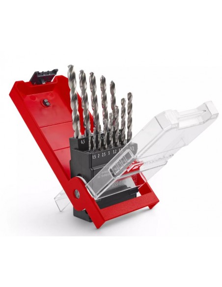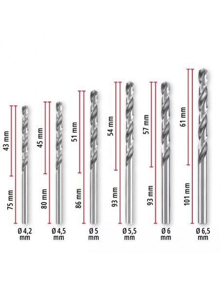 Il set copre i diametri più comuni (da 1,5 a 6,5 mm), risultando adatto per lavorare su acciaio, metalli non ferrosi, alluminio, lamiera e plastica. Non è invece indicato per l’acciaio inox.