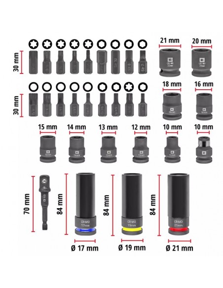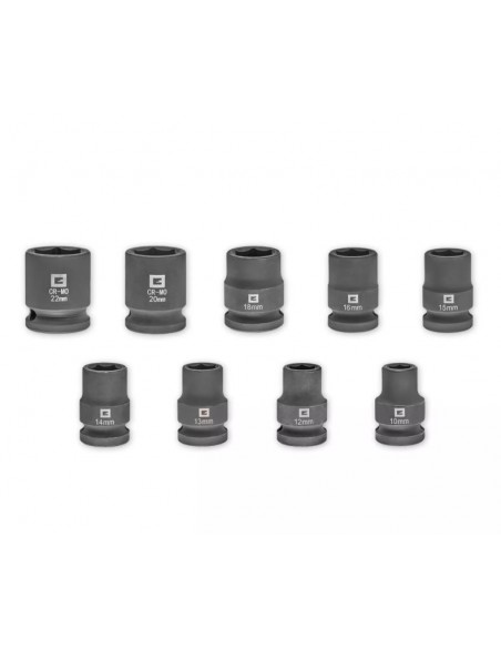 Le 9 bussole esagonali da 40 mm in acciaio CrMo (10–22 mm) sono ideali per lavori di serraggio gravosi, mentre le 3 bussole lunghe da 80 mm (17, 19 e 21 mm) con rivestimento protettivo antigraffio permettono di sostituire le ruote in tutta sicurezza, proteggendo i cerchi in lega leggera.