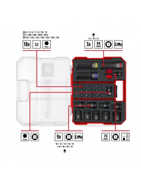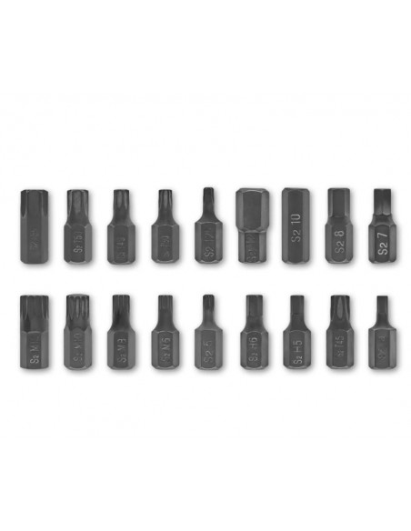 Gli 18 inserti resistenti agli urti da 30 mm, realizzati in acciaio S2 fosfatato al manganese, offrono una resistenza superiore rispetto all’acciaio CrV e permettono di affrontare lavorazioni con coppie elevate. Coprono gli attacchi più diffusi in campo automobilistico: Torx, Hex e multi-dente.