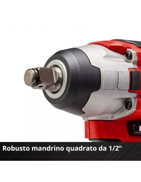 Il design è compatto e leggero, con un peso di soli 1,17 kg, che consente un utilizzo prolungato senza affaticamento. Il porta utensile da 1/2” è robusto e versatile, e il bit adapter incluso consente anche operazioni di avvitatura standard. La luce LED integrata assicura una visibilità perfetta anche in ambienti bui, come box o garage.