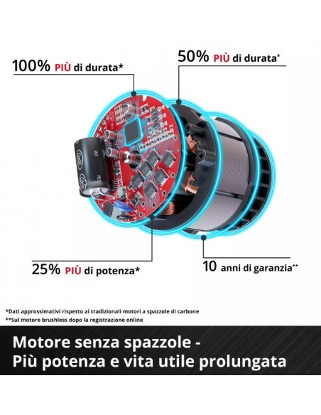 Il potente motore brushless Einhell PurePOWER assicura prestazioni superiori rispetto ai tradizionali motori a spazzole: più potenza, meno usura, maggiore autonomia. Una tecnologia talmente affidabile da essere coperta da 10 anni di garanzia (con registrazione online).