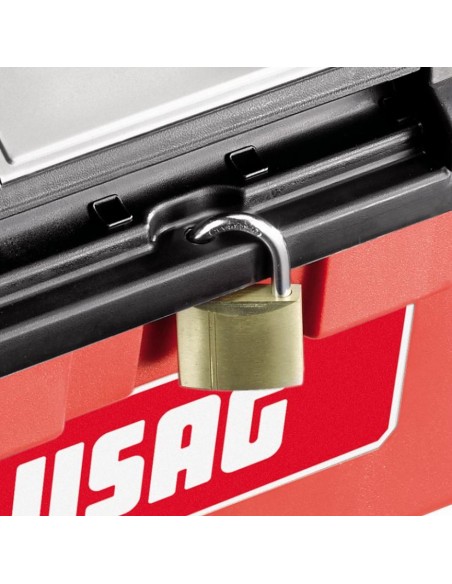 La cassetta è predisposta per la chiusura con lucchetto (non fornito), così da aumentare la sicurezza degli utensili durante il trasporto o lo stoccaggio. L’impugnatura a scomparsa garantisce ingombro minimo e maggiore praticità, mentre il vassoio interno amovibile permette di organizzare gli attrezzi in base alle proprie esigenze.