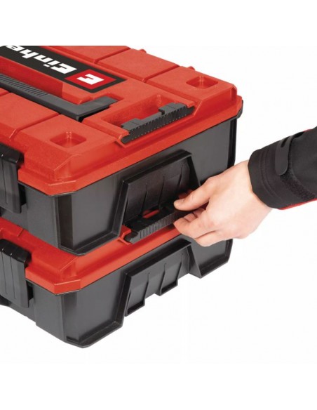 La valigetta Einhell E-Case S-F è progettata per offrire una soluzione pratica e sicura per il trasporto e la conservazione di utensili e accessori. Appartenente al sistema modulare E-Case, consente di impilare e collegare più valigette grazie all’apposito meccanismo di aggancio rapido, garantendo ordine e facilità di movimentazione anche durante il trasporto.