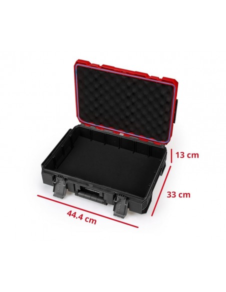 Le dimensioni della valigia sono 44 cm di larghezza, 33 cm di profondità e 13 cm di altezza. Questo formato compatto la rende pratica da riporre, facile da trasportare e perfetta per sfruttare al meglio lo spazio in officina, nel veicolo da lavoro o nel magazzino.