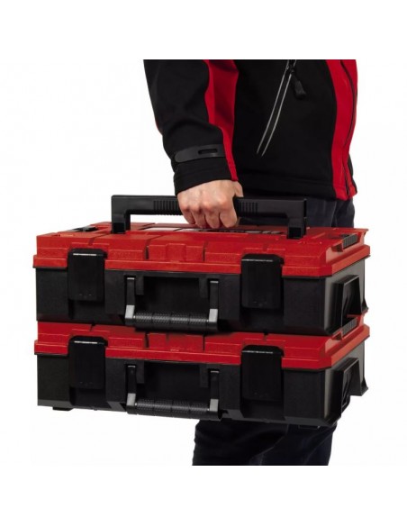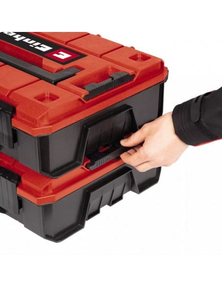 Uno dei punti di forza della Einhell E-Case S-F è il sistema di blocco delle custodie impilate, studiato per mantenere ordine nello stoccaggio e facilitare il trasporto di più valigette sovrapposte. Questo sistema consente anche di aprire una singola custodia quando è impilata, migliorando notevolmente la praticità d’uso in officina, in magazzino o durante gli interventi sul lavoro.