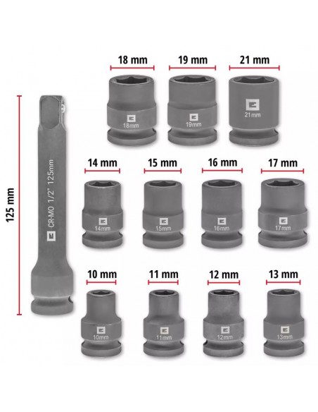 Set da 12 pezzi con 11 bussole esagonali da 40 mm + prolunga da 125 mm