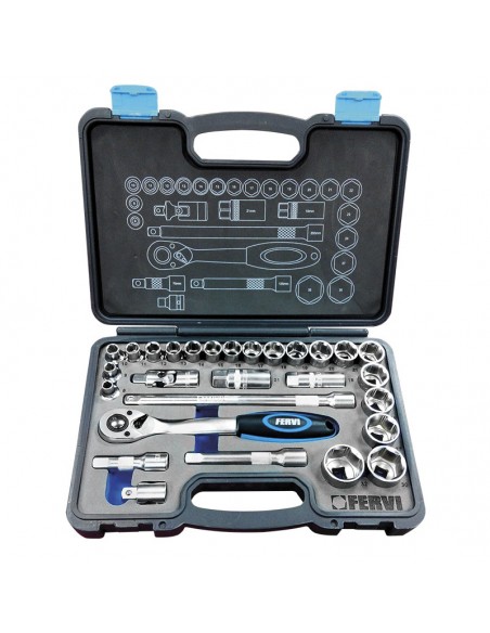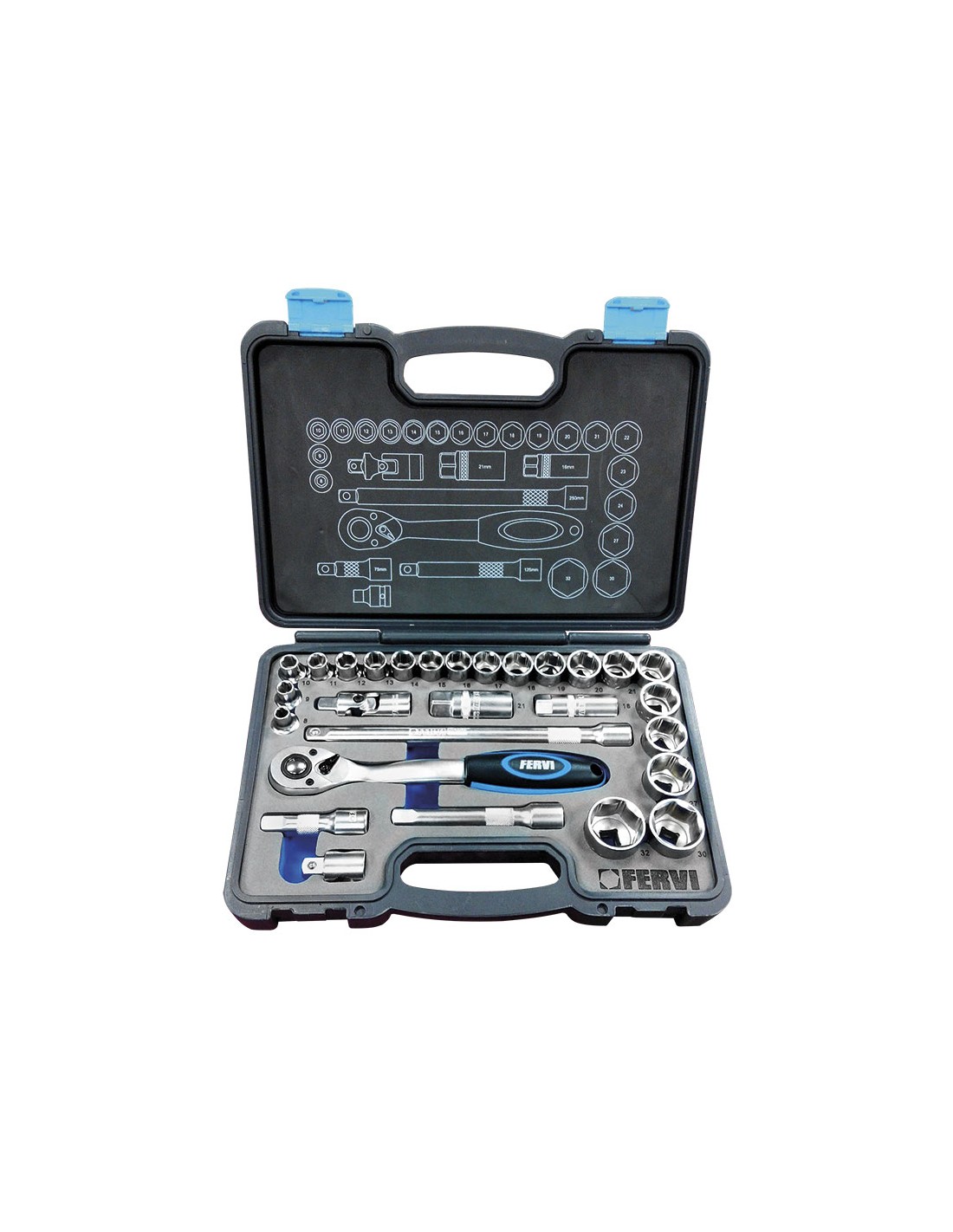 Set serie chiavi 28 Pz a bussola Fervi S328 da 1/2" in valigetta con prolunghe e snodo