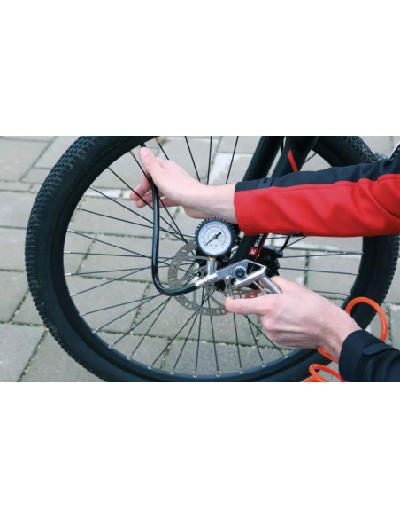 Dotata di manometro integrato, consente di eseguire controlli di pressione precisi in ogni momento. La valvola di sicurezza permette di scaricare l’aria in eccesso, portando la pressione al livello ideale e preservando la durata dei pneumatici.