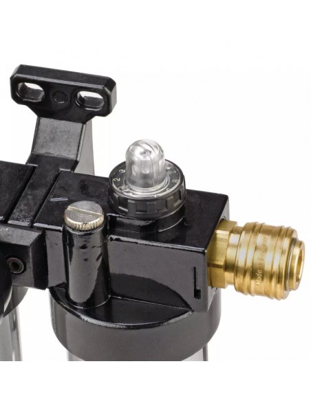 Il serbatoio trasparente con finestra di controllo permette di monitorare facilmente il livello dell’olio, mentre la vite di regolazione consente un dosaggio preciso. La struttura robusta e compatta rende questo accessorio perfetto sia per officine professionali che per garage e hobbisti esigenti.