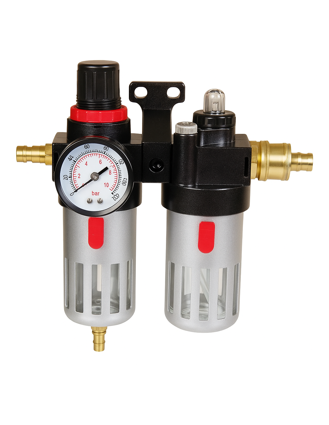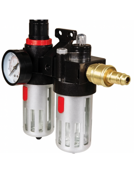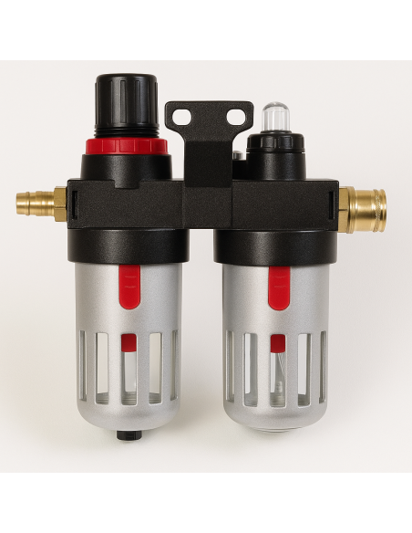 Grazie al sistema 3 in 1 con riduttore di pressione, filtro e lubrificatore a olio, questa unità assicura aria compressa pulita, secca e lubrificata, prevenendo l’usura dei componenti interni degli utensili e migliorandone le prestazioni.