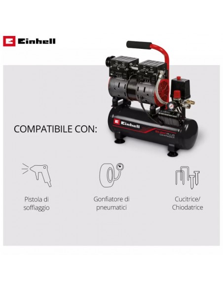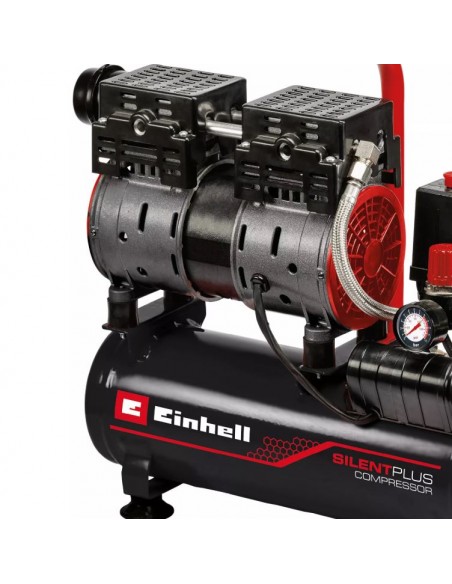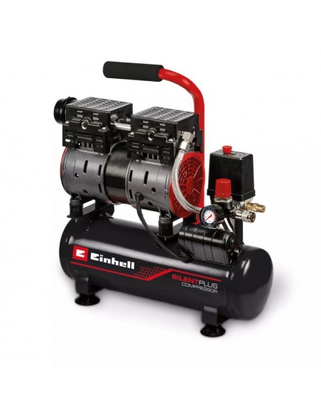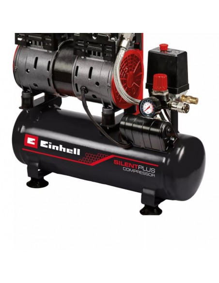 Il compressore silenziato Einhell TE-AC 110/6 Silent Plus è la soluzione ideale per lavorare in garage o officina riducendo al minimo il rumore. Con un livello sonoro di soli 57 dB(A), risulta molto più silenzioso rispetto ai compressori tradizionali della stessa categoria.