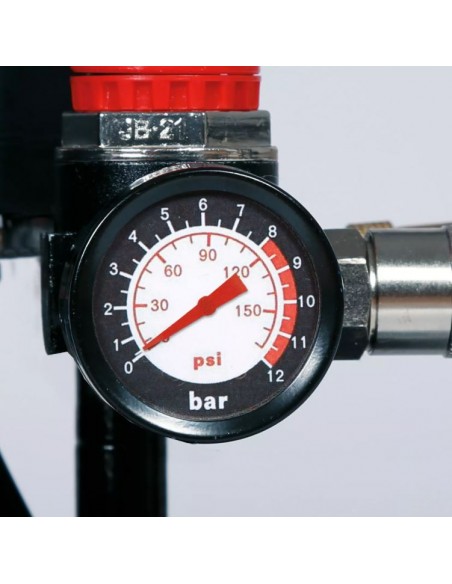 Il compressore è equipaggiato con riduttore di pressione, manometro e attacco rapido, oltre a una valvola di sicurezza e uno scarico condensa per una manutenzione rapida. Il design compatto, il peso contenuto e la maniglia ergonomica ne facilitano il trasporto, mentre le gambe antivibrazione assicurano stabilità durante l’uso.