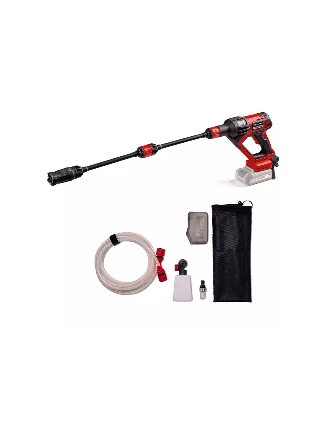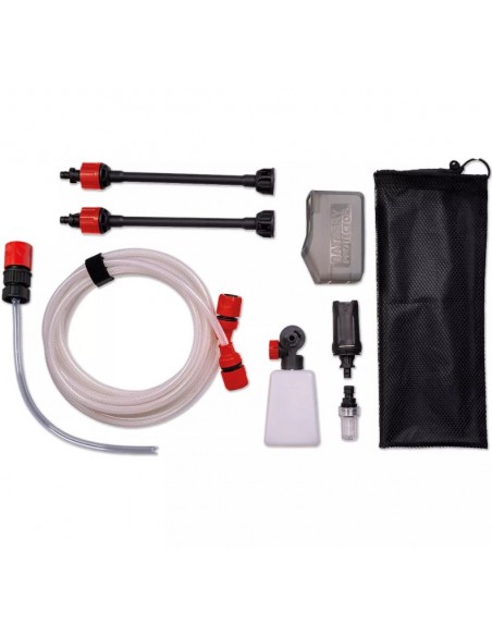 Nella dotazione troverai tutto il necessario per iniziare: 2 lance di estensione, bottiglia per schiuma, paraspruzzi protettivo per la batteria e una borsa a rete per riporre comodamente gli accessori.