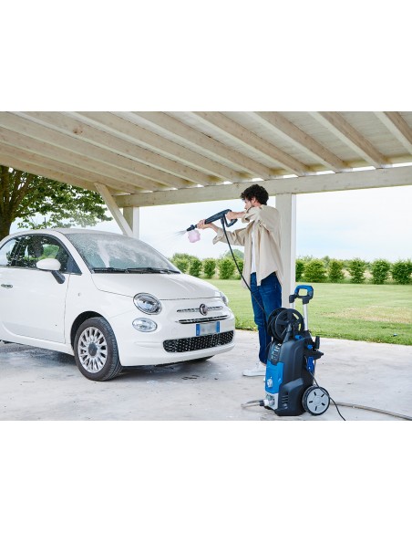 La struttura è compatta, antiurto, montata su 2 ruote gommate per garantire stabilità e trasporto agevole con manico telescopico. L’avvolgitubo integrato con tubo alta pressione da 10 metri consente di lavorare agevolmente anche su grandi distanze, mentre il filtro acqua ispezionabile protegge la pompa da impurità e prolungando la vita della macchina.