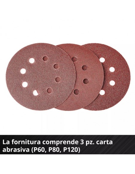 Il disco abrasivo da 125 mm è dotato di fissaggio a strappo, per una sostituzione rapida della carta abrasiva. In dotazione sono incluse 3 carte abrasive (grana P60, P80, P120). Il sistema di aspirazione integrato con scatola raccoglipolvere e filtro pieghettato assicura un ambiente di lavoro pulito. Per una maggiore efficienza, è possibile collegare un aspirapolvere esterno tramite l’adattatore da 35 mm.