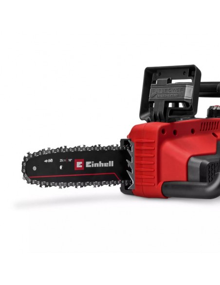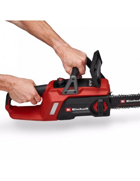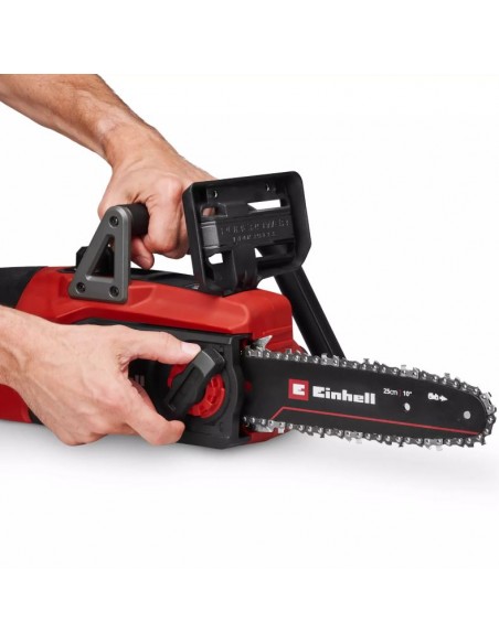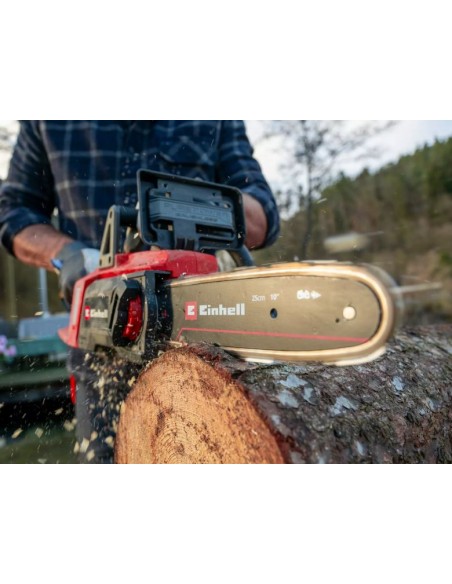 La sega a catena a batteria Einhell GE-LC 18/25 Li BL-Solo Professional unisce potenza, sicurezza e maneggevolezza in un unico strumento compatto, perfetto per potare, abbattere piccoli alberi e tagliare legna da ardere.