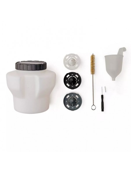 Il tubo dell’aria da 1,8 m, la tracolla, e la stazione di soffiaggio separata rendono l’utilizzo particolarmente confortevole, anche in sessioni prolungate. La protezione integrata per batteria impedisce danni da spruzzi o polvere, mentre la testina smontabile facilita le operazioni di pulizia. In dotazione anche una spazzola, ago di pulizia, contenitore con scala graduata e tappo, e strumento per la misurazione della viscosità.