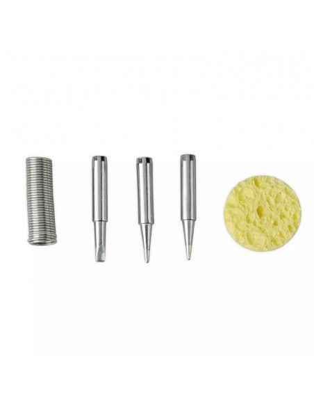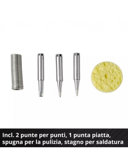 - Inclusi 2 punte per saldatura a punti, 1 punta piatta, stagno Ø 1,0 mm e spugna per pulizia