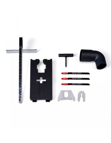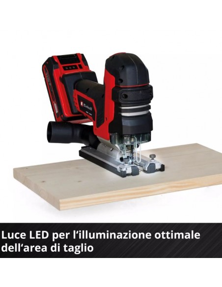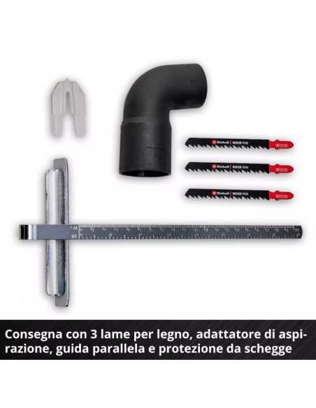 Il porta lama universale senza attrezzi semplifica il cambio della lama, mentre la piastra di base in alluminio garantisce stabilità e precisione anche nei tagli obliqui fino a 45°. Il seghetto offre profondità di taglio fino a 135 mm nel legno e 10 mm nell'acciaio. Dotato di protezione antischegge, inserto anti-graffio, soffiaggio della polvere e adattatore per aspirazione, garantisce una linea di taglio sempre pulita e visibile.