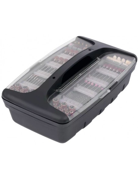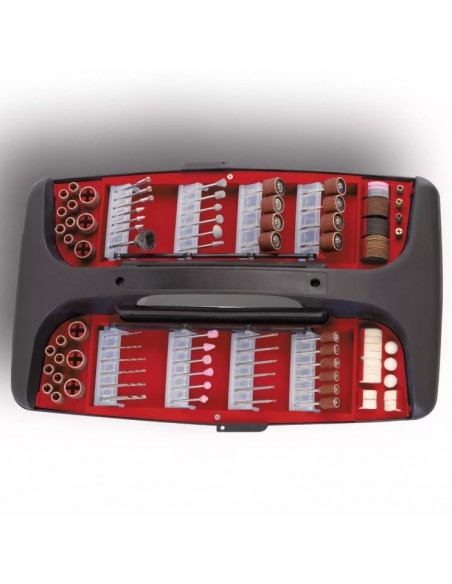 La fornitura comprende un set completo da 189 accessori per affrontare qualsiasi tipo di lavorazione, il tutto racchiuso in una robusta valigetta per riporre e trasportare in modo ordinato ogni componente.