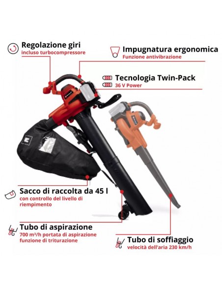 Il soffiatore/aspiratore per foglie Einhell GE-CL 36/230 Li-Solo è lo strumento ideale per mantenere giardini, vialetti e terrazze sempre puliti da foglie, aghi di pino e piccoli rami.
