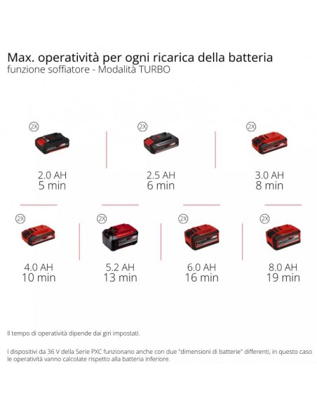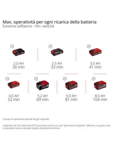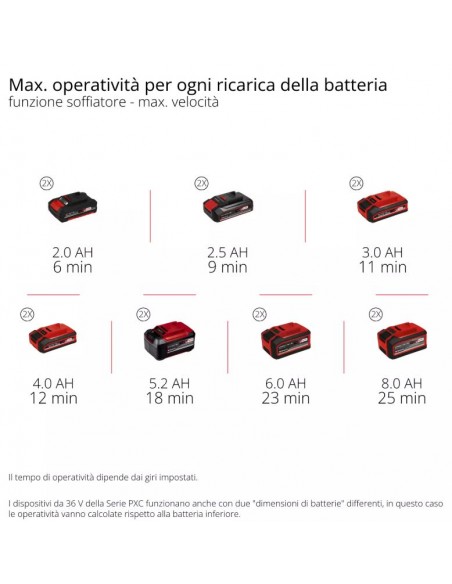 Il soffiatore viene fornito senza batteria e caricabatterie, disponibili separatamente o in pratici kit di avviamento Power X-Change.