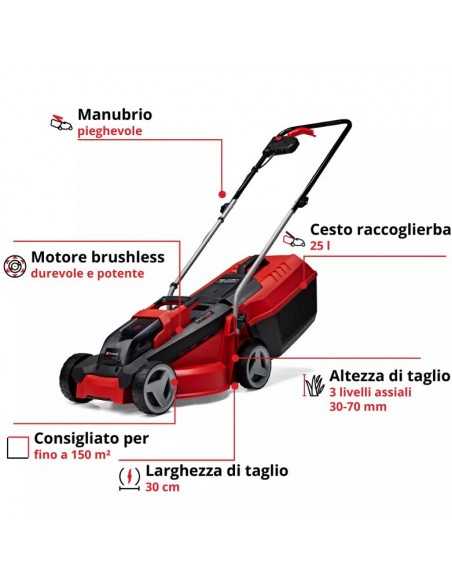 Tosaerba a batteria Einhell GE-CM 18/30 Li completo di kit batteria 3.0Ah 18V e caricabatteria Regolazione taglio a 3 livelli