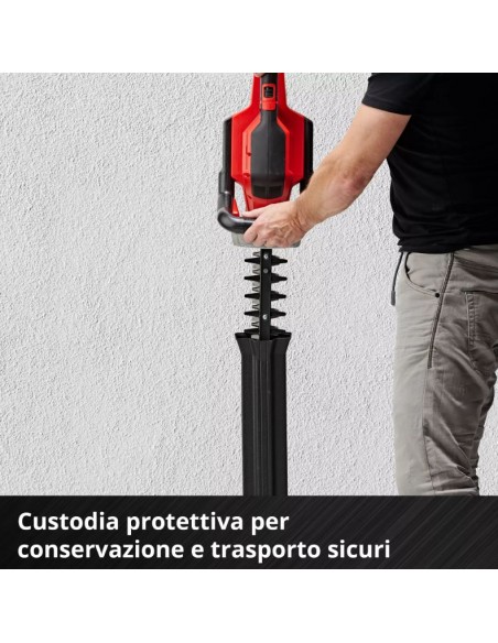 Progettato per il massimo comfort, è dotato di manico girevole, impugnatura ergonomica anteriore con microinterruttore, raccoglitore del materiale tagliato e protezione antiurto. Viene fornito con coprilama in alluminio, supporto da parete e custodia rigida per trasporto e stoccaggio.