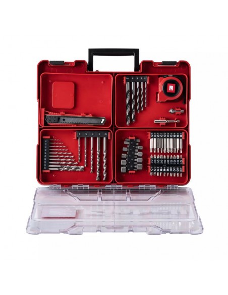 Fornito con batteria da 2.0 Ah, caricabatterie e un set completo da 64 accessori, il tutto contenuto in una comoda valigetta rigida per il trasporto e l’organizzazione.