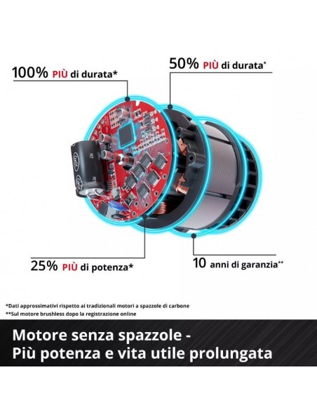 Il motore Brushless senza spazzole garantisce prestazioni superiori, maggiore efficienza e una durata significativamente più lunga rispetto ai motori tradizionali a spazzole.